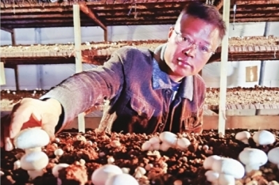 新洲区菇正源蘑菇厂负责人冯强义在检查蘑菇长势。长江日报记者詹海波 摄