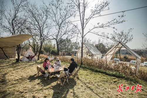 冬日的阳光照在黄陂区横山脚下,萝卜、包菜、生菜等时令蔬菜长势正旺。走进“一心回乡”生态农场,草地上搭着纯白帐篷,素雅花朵装点着木质桌椅,精致田园风令人眼前一亮。不少武汉市内的年轻家庭选择来这里度过周末时光。