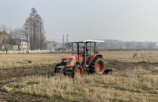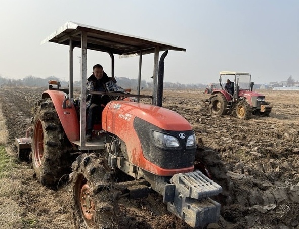 在黄陂区应咀农机专业合作社,农机手驾驶着拖拉机翻土作业。目前,应咀村全村的耕地都使用合作社的农机翻土作业,翻土之后再用平地机平整土地。