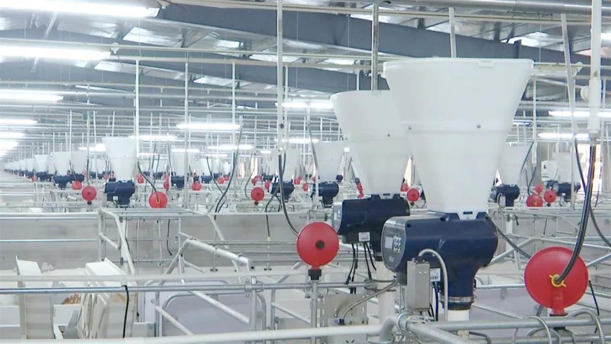 养殖基地内,数智化核心车间均已建设完成,工作人员正在进行最后的设备安装和检修工作。车间内部宽敞明亮,一排排养殖栏位整齐排列,每一栏均配备了智能化喂水投料设备,科技范十足。