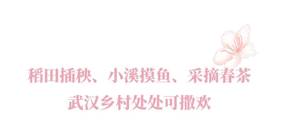 三月中下旬开始,正是各地茶园嫩芽勃发,茶农们抢抓时节开采春茶的好时机,也是市民下乡体验采茶、炒茶、品茗乐趣的好时候。江夏区山坡街生态茶园,背靠天子山,毗邻梁子湖、山坡湖,优越的自然环境让山坡光明茶品质上乘,被农业农村部认定的国家农产品地理标志产品。黄陂区蔡家榨街红岗山村,有座花乡 茶谷,这里被木兰湖、云水湖两湖相拥,山上古木成林,泉多、奇石多,山花烂漫,恍若世外桃源。园区内有山、水、花、茶,市民在园区,踏青、赏花、采茶、小溪里摸鱼钓虾,一站式花样踏青,乐在其中。进入四月,就到了武汉春耕最忙碌的时节。水稻种子是如何发芽的,插秧的深度怎么把握,水稻和大豆“间作”在一块,为什么能提高产量?带着这些问题,来乡村做一次“都市农夫”吧,新洲区丰乐村紫薇都市田园、蔡甸区火焰村十里莲花景区等地,纷纷推出了形式多样的“农耕文化·插秧活动”。春天万物复苏,荠菜、野菠菜等各种野菜也钻出了泥土。乡野间,能挖到些什么宝贝呢?大小朋友们,挖到的到底是新鲜的小野菜,还是小青菜或者小草,这些“野菜的小秘密”,不仅在十里莲华能得到 专业的答案,小朋友们还能在厨师伯伯的带领下,通过一步步学习,亲手制作属于 春天的食物。