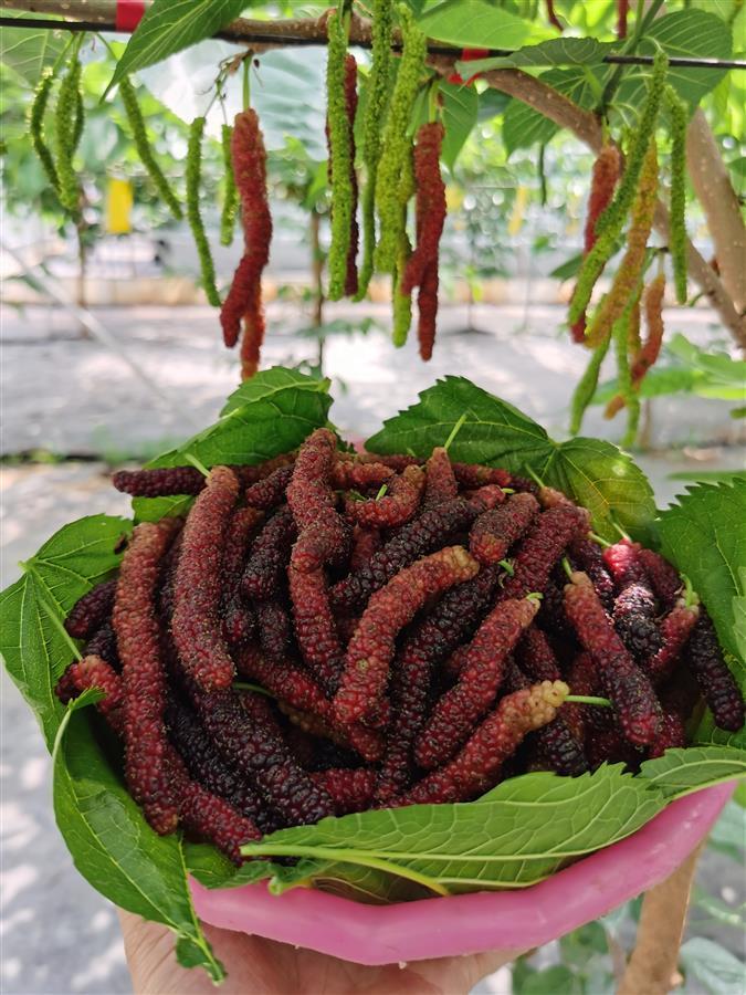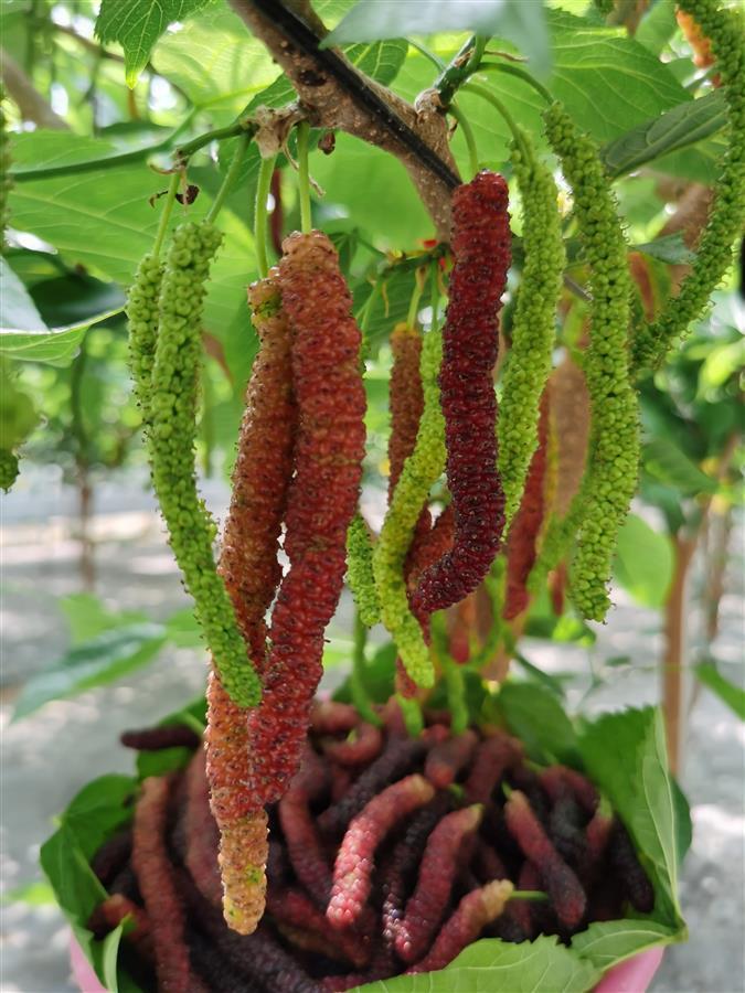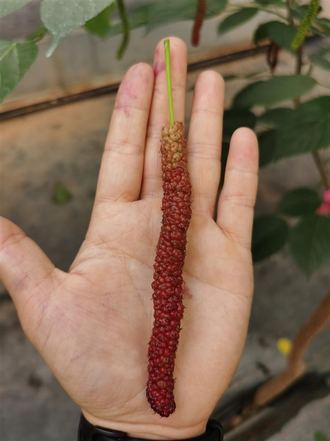 据了解,长果桑是台湾专家将大果桑和野生长果桑经过多次授粉研发改良而成。其果形修长,一般8厘米至13厘米,是普通桑葚的4至5倍,最长可达18厘米,糖度高达18%到22%,一年可结两到三季果,是目前采摘园争相引进的新品种。