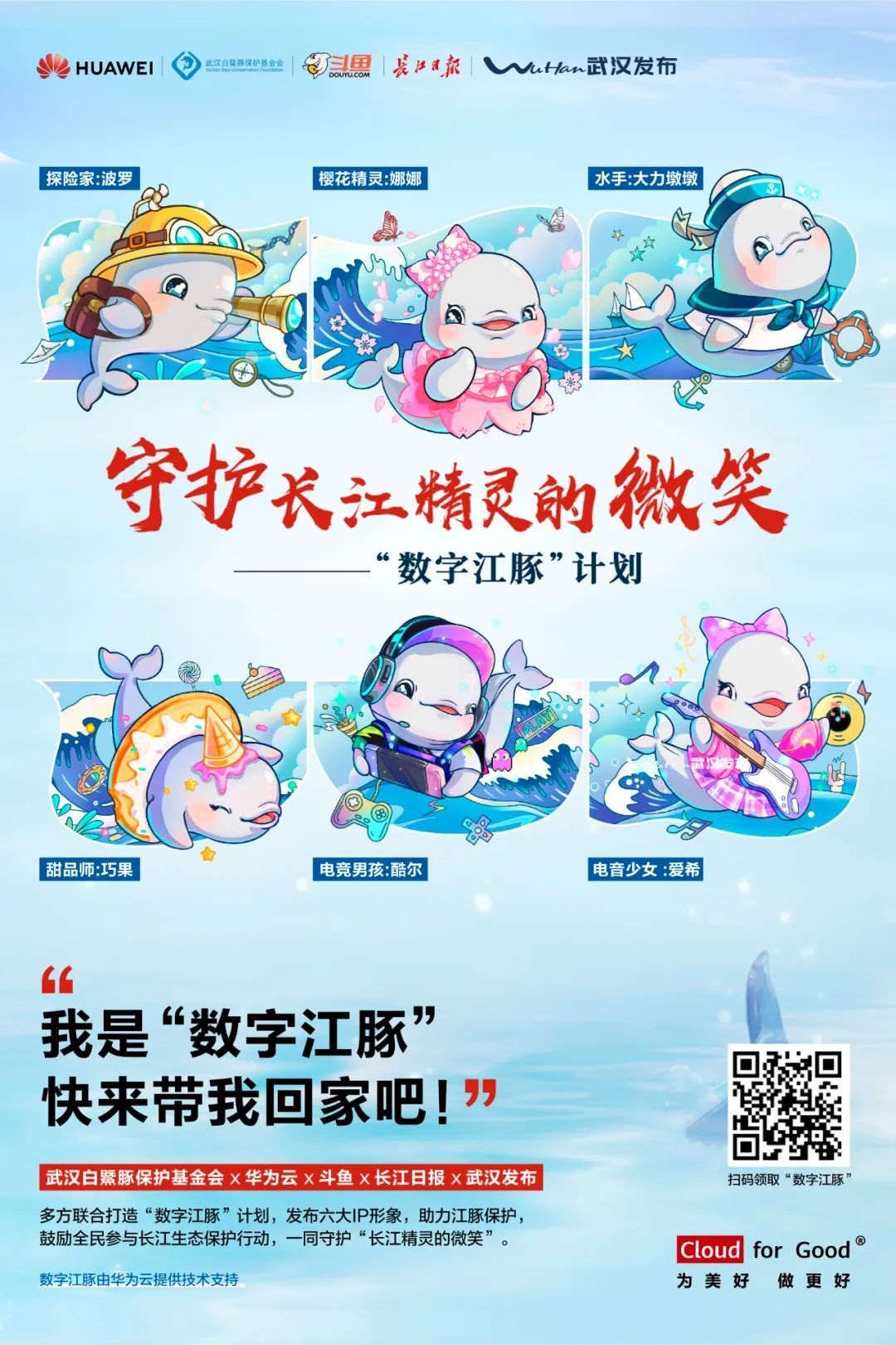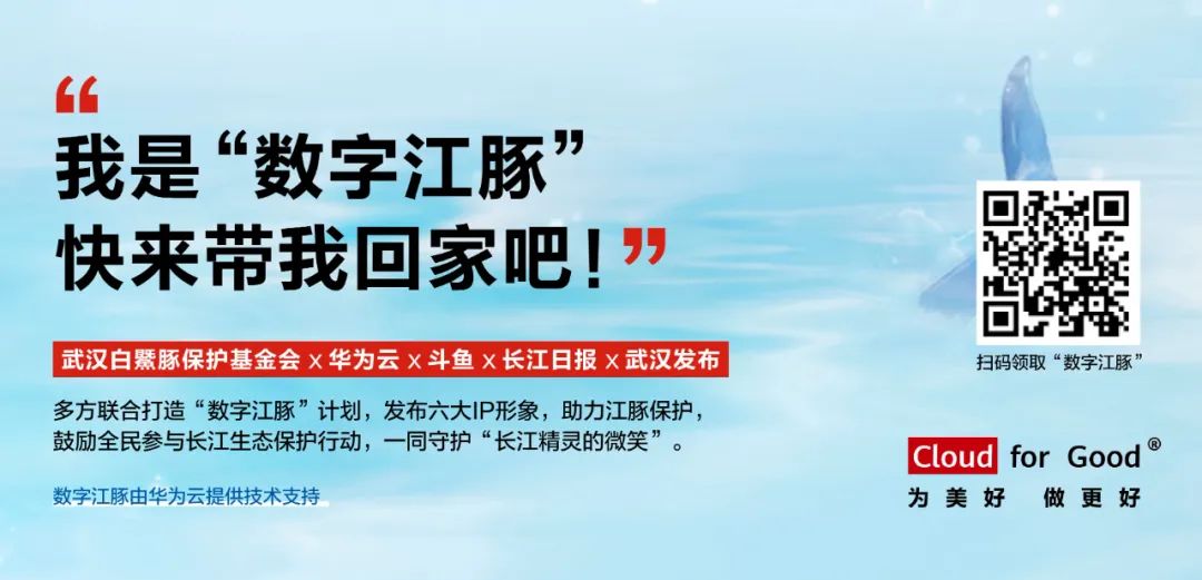 在武汉市农业农村局、武汉市生态环境局等相关单位的支持下,武汉白鱀豚保护基金会6月发起了第二届“全民爱豚月”活动,华为云、武汉白鱀豚保护基金会、斗鱼、长江日报、武汉发布共同发布了6只憨态可掬的“数字江豚”,为大众了解“长江精灵”提供了新途径。