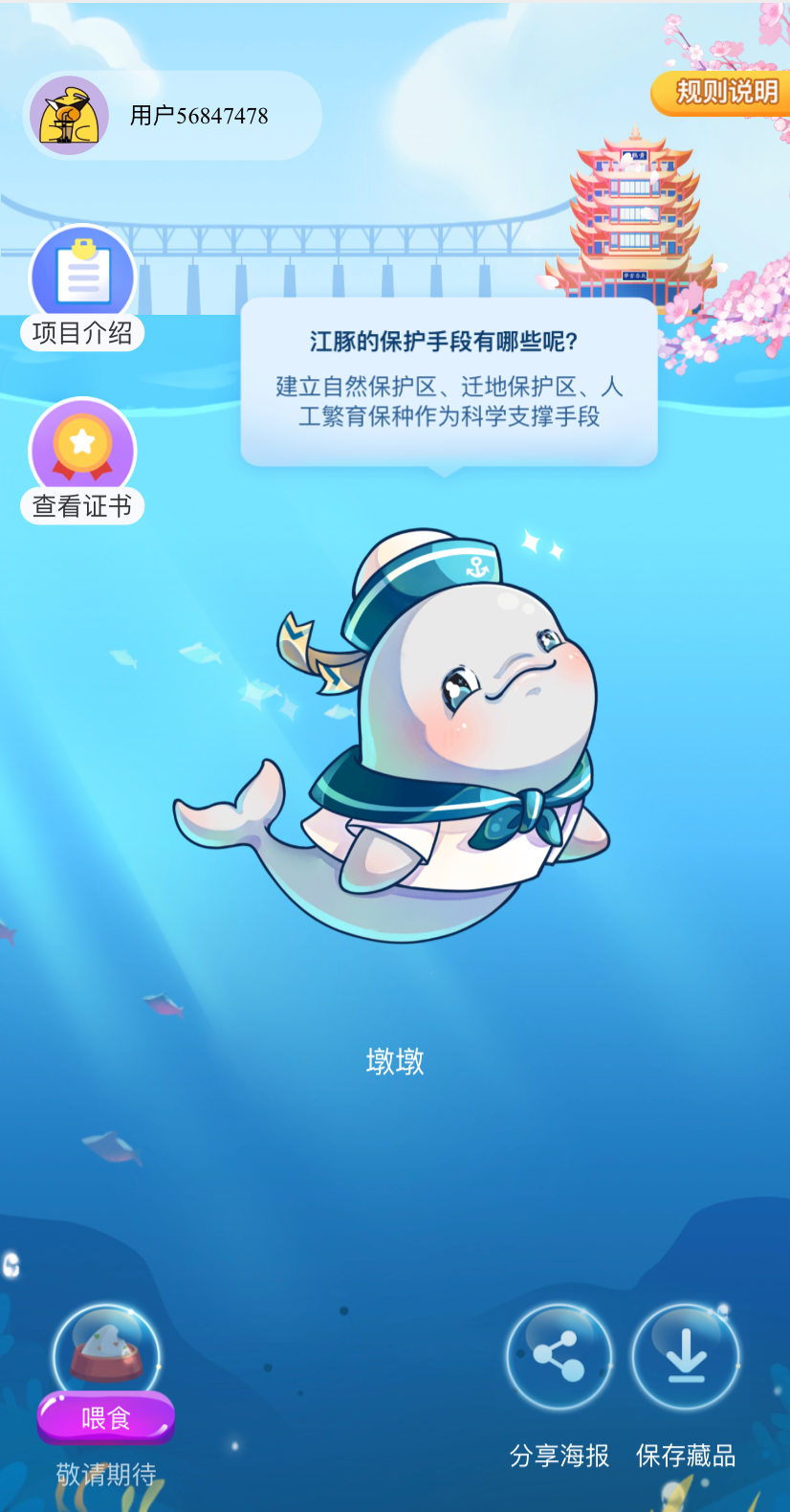 汉小布领取了一只“水手大力墩墩”,这是一只穿着海军服的胖胖小江豚,点击江豚会出现知识小问答。江豚如何呼吸?它们能潜水多久?如何计算江豚的数量?能学到不少科普知识。