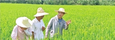 兴红良种养殖专业合作社负责人徐兴旺(中)和凤凰镇农技专家在基地商量水稻“开镰”事宜。