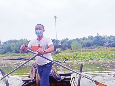 村民王开海摇着渔船下湖捞菱角,身后就是刚刚建好的5G基站