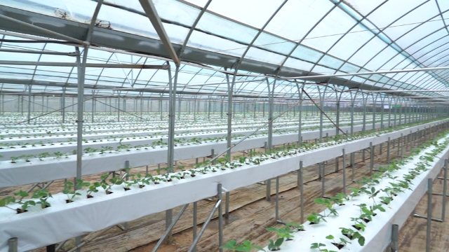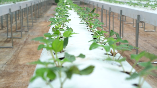 据了解,无土栽培的种植槽主要由钢和PE材料制作而成,能有效促进草莓根系发育,提高草莓生长效率。此外,种植槽里装着的也并非土壤,而是适合草莓种植的已经发酵好的椰糠,可以避免种植过程中出现土害、虫害及土壤板结、盐碱等问题。种植槽内两条细长的滴灌带覆盖于椰糠之上,给草莓带去营养。