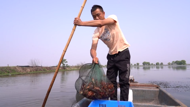 上午九点,法泗街庆丰村养殖户易世威正在自家承包的110亩稻虾轮作田里查看小龙虾的长势。记者看到,虾田中一排排地笼整齐排放着,易世威划着小船,将沉在水里的虾笼提起,一只只生龙活虎的小龙虾顺势滚落篮筐。易世威告诉记者,自小龙虾3月上市,他每天起虾苗400斤,成虾200斤,价格分别在20元每斤和45元每斤左右。
