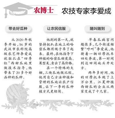 李爱成驻守江夏瓜地的两年多时间,种植西甜瓜的企业从两家变成了十几家,李爱成的旧摩托车跑了上万公里。