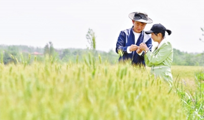 今年“三夏”期间,潘培和丈夫贺迎新查看麦穗灌浆情况。