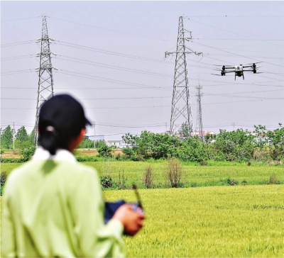 三夏时节,武汉乡村大地一片繁忙景象。在黄陂区六指街道港湾永旺农机专业合作社水稻种植示范基地,无人机正在进行水稻飞播作业。为让水稻种植更加高效轻松,合作社的农机手将晾晒干的水稻种子,定量装进无人机播撒箱,开机、起飞、播撒……伴随着旋翼的嗡鸣声,一台搭载着水稻种子的农用无人机飞上了天空,在农机手的操作调试下,按照既定路线穿梭于田间地头,有序播种5分钟便完成了20亩水田的播种任务。