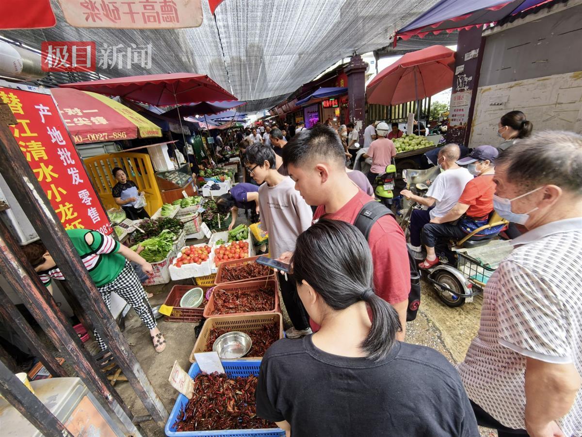 6月23日,端午假期第二天,武汉天气凉爽。早上8时许,极目新闻记者来到汉口长港路与姑嫂树路交会处的大型露天菜市场,门口一家销售小龙虾的档位前围着不少市民,正在选虾、称虾。