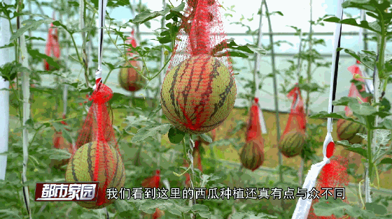 走进大棚,这里的西瓜种植还真有点与众同,大部分的西瓜一般都是在地上生长,而这里的西瓜都是吊着生长。