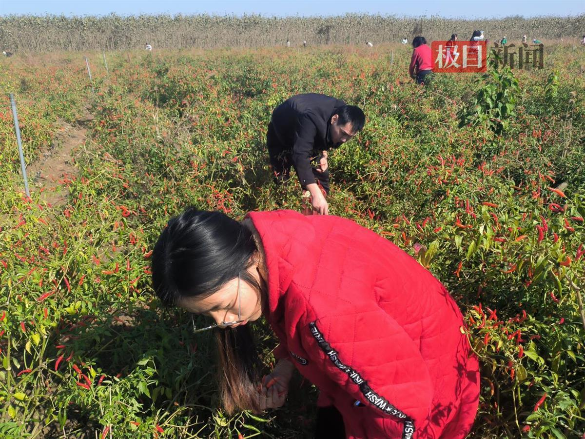 11月8日,在武汉市新洲区三店街董椿村辣椒园内,一排排火红的小米辣椒引来大量村民驻足采摘,现场还不时传来打闹嬉笑声,村民们通过用手机拍摄采摘视频,发朋友圈来分享自己的喜悦。