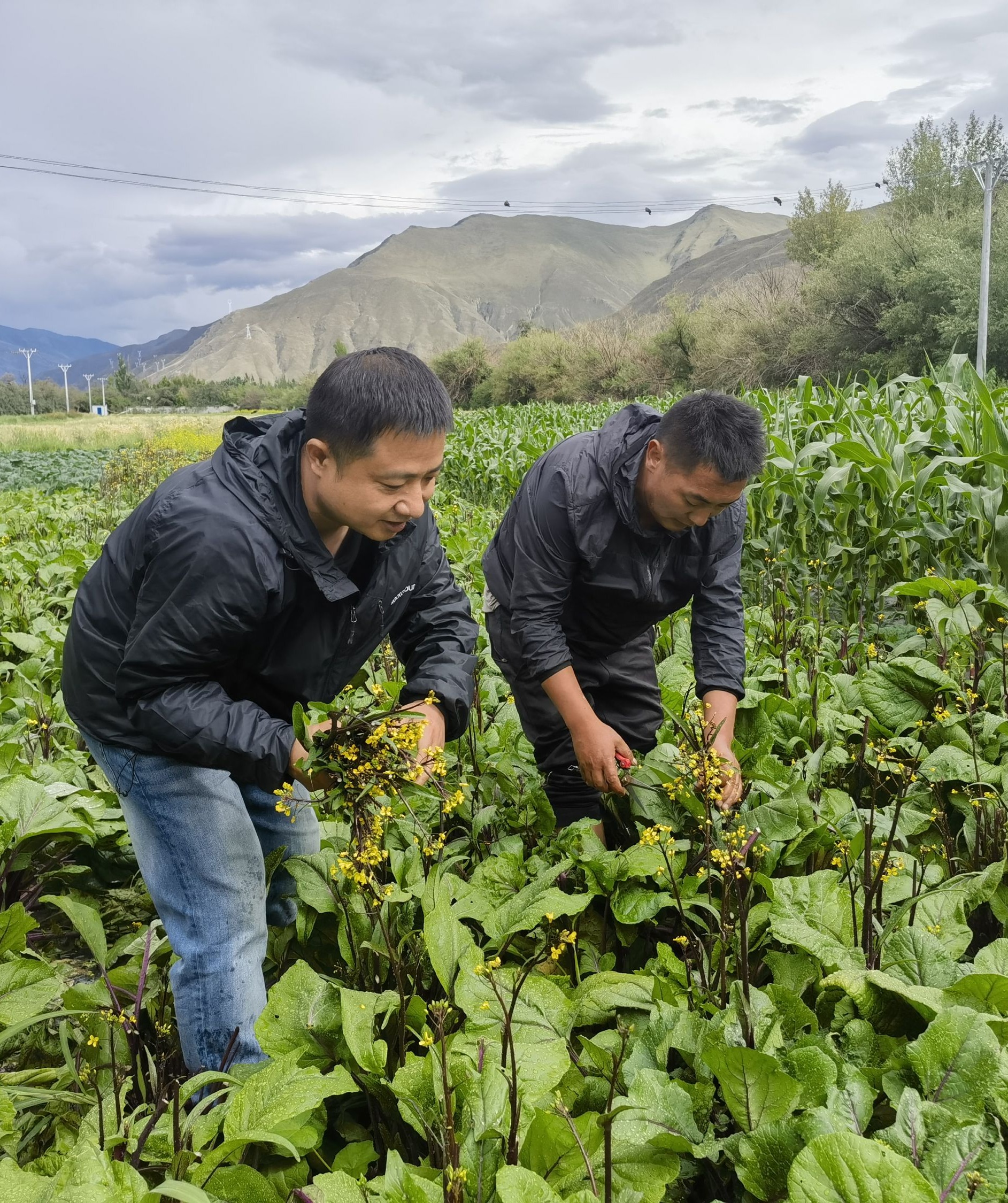 许国建(左)和藏族同事格桑在红菜薹田里采摘