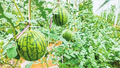 大棚里,绿油油的西瓜藤蔓顺势生长,一个个足球大小的西瓜匀称光滑、圆润饱满,掩映在藤蔓间。