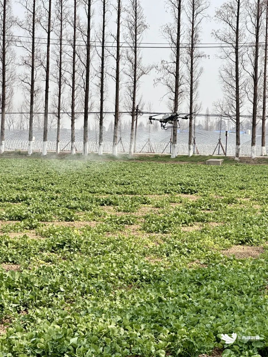 在柳小昌的操控下,植保无人机腾空而起,按照设定航线,在菜地上空来回穿梭,将雾化农药均匀喷洒在菜地上。