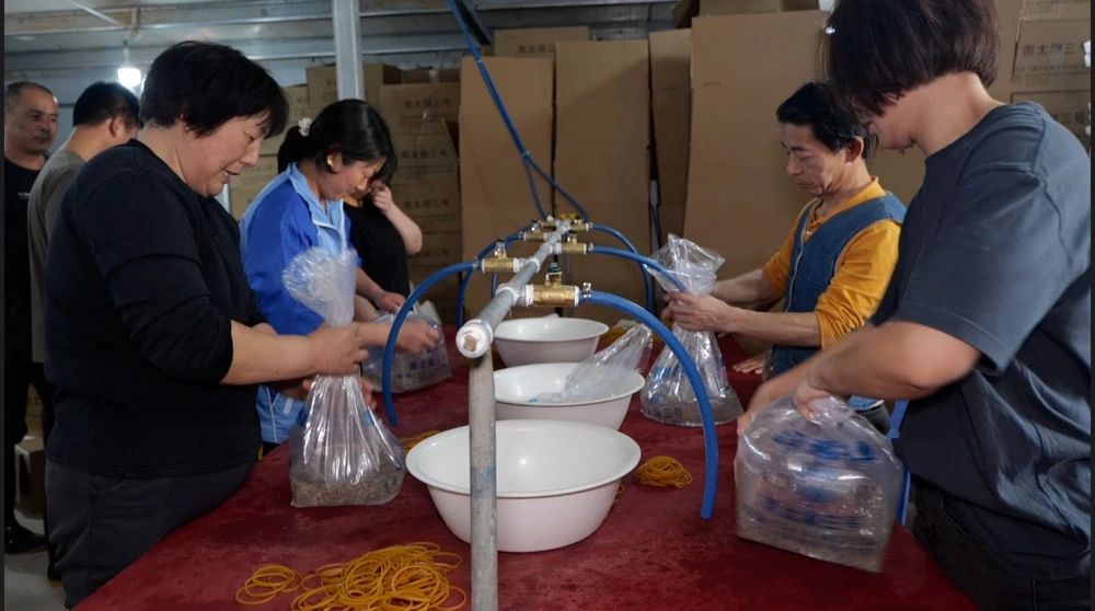 温热的罗氏沼虾良种扩繁车间内,工作人员正在给虾种喂食糯米;装运车间内,工作人员忙着装袋、充氧、装箱,然后发给预定虾苗的养殖户。