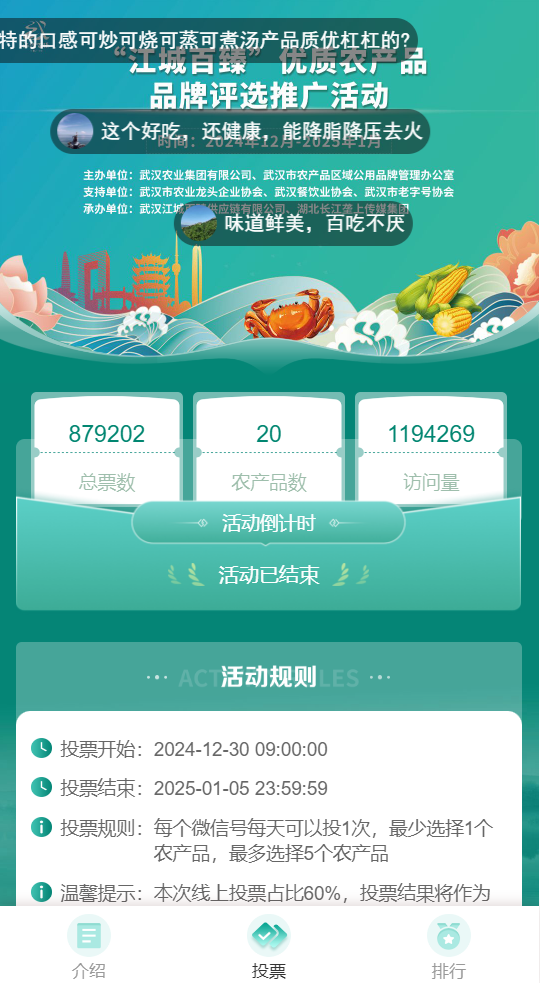 活动自2024年11月份启动以来,得到目录企业的积极参与和社会各界的广泛关注,申报的农产品品牌涵盖粮油、水产、果蔬、茶叶等各类农产品及加工品。评选采用线上投票、线下评审相结合的方式进行,网络投票环节,初选入围的20强农产品网上投票时间访问量达到119.4万人次,不仅起到了很好的宣传效果,也对“江城百臻”品牌目录优质产品进行了集中精彩展示。