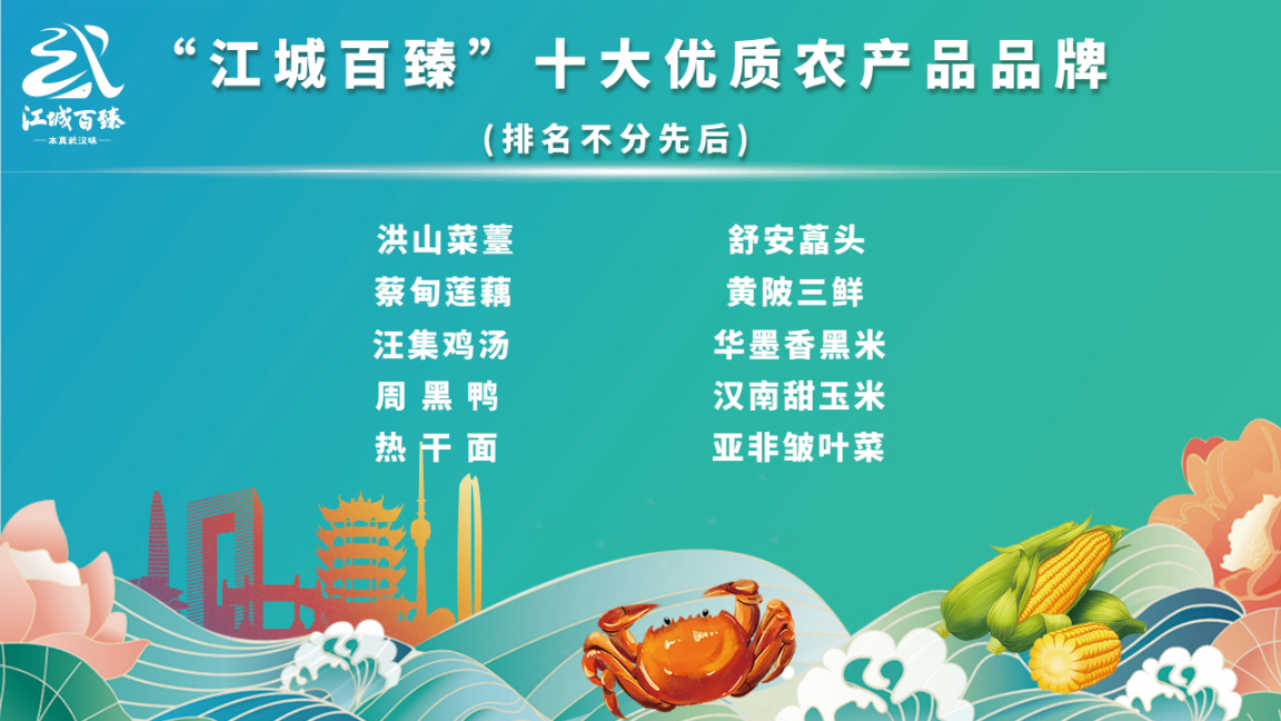 “江城百臻”十大优质农产品品牌:洪山菜薹、周黑鸭、蔡甸莲藕、热干面、汪集鸡汤、亚非皱叶菜、黄陂三鲜、汉南甜玉米、华墨香黑米、舒安藠头