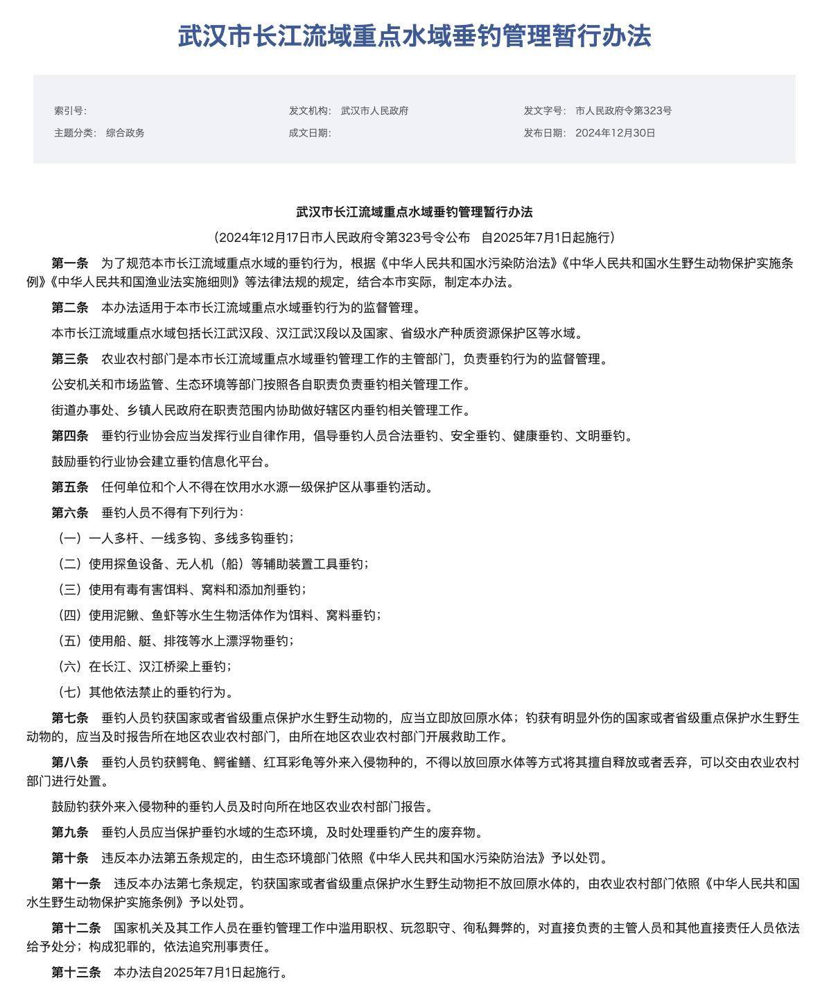 6月30日,从武汉市规范长江流域重点水域垂钓管理新闻发布会获悉,《武汉市长江流域重点水域垂钓管理暂行办法》(以下简称《办法》)将于7月1日起施行,明确规定了六类被禁止的垂钓行为。
