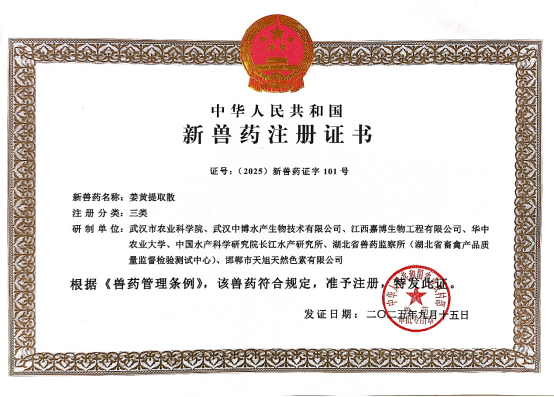 近日农业农村部发布第949号公告,由武汉市农业科学院牵头,联合中国水产科学院长江水产研究所、武汉中博水产生物技术有限公司等单位历时近十年研发的“姜黄提取散”成功获批国家三类新兽药。