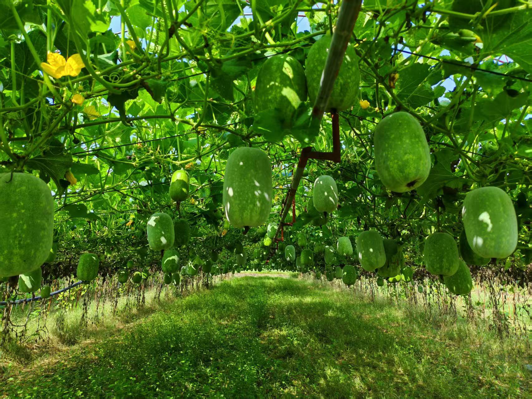 香芋水果冬瓜是引进的国外新品种,价格虽不便宜,但刘清觉得,农业也要创新,应该开发既能适应土地气候条件、附加值又高的产品。谈起自家的冬瓜,刘清就滔滔不绝,这种冬瓜自带香芋风味,去皮后可以直接生吃,清甜多汁,煲汤后更是软糯香甜,亩产可达6000至10000斤。因其优异的口感以及独家品种,盒马鲜生、小象超市等商超、平台早在种植初期就主动联系,签下包销协议。