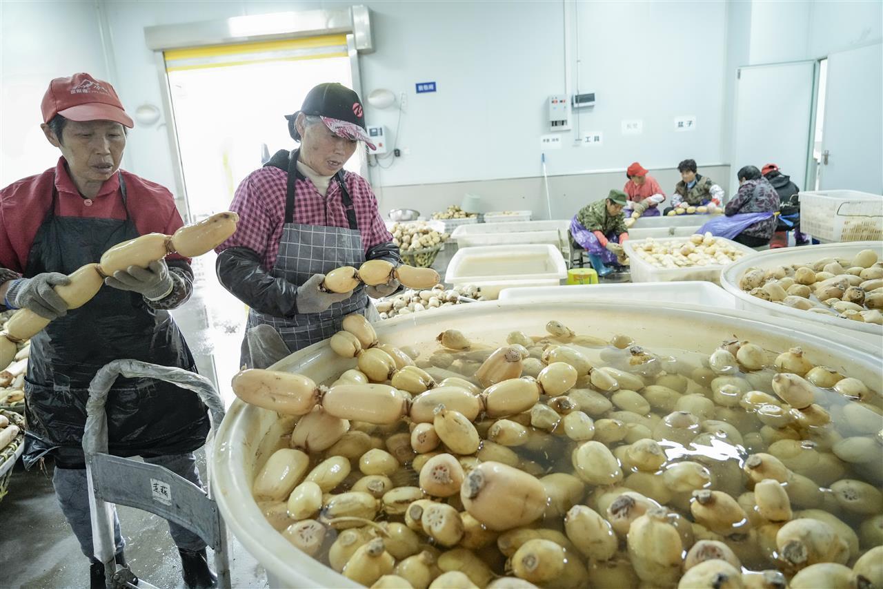 从藕塘采收的一车车新鲜莲藕,带着泥土的芬芳香味被送到相距不远的武汉绿乐农业科技有限公司的车间。在这片正在扩大规模的加工基地里,工人们正在熟练地进行清洗、加工、分级、包装,忙得不亦乐乎。