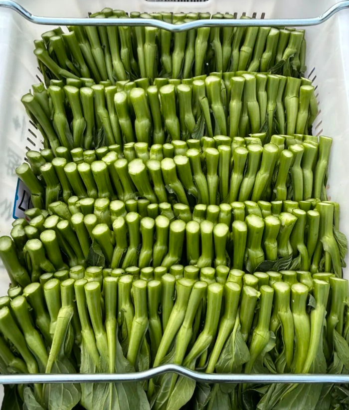 在黄陂区祁家湾街廖岗村的采收现场,绿油油的板蓝根菘菜心长势喜人,叶片舒展、苔茎粗壮。工人们穿梭田间,熟练地采摘、装筐,满载新鲜菜心的筐子整齐排列在田埂上,随后被运往冷库储存,全程冷链保障蔬菜新鲜度。