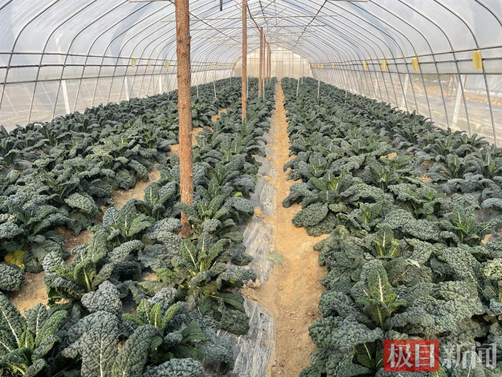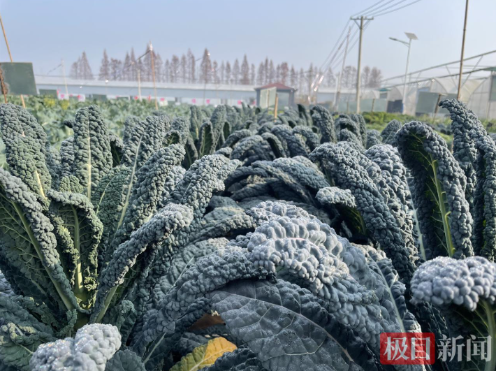 近日,极目新闻记者来到武汉经开区湘口街道汉南种业小镇的亚非农业科技园探访,这里种植着多个品种的皱叶菜。记者看到,田地和温室大棚里成片的皱叶菜长势喜人,放眼望去,一片片绿油油的皱叶菜在阳光的照耀下显得更加光亮和鲜嫩。走近发现,与大多数蔬菜不同的是,皱叶菜的叶片凹凸不平,一些菜叶的表面点缀着一层白色物质,像镀上了一层“白霜”。虽然叶片皱巴巴的,但摸起来手感却光滑柔软。