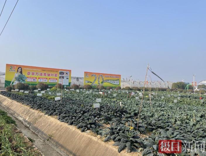 在亚非农业科技园,广告牌上的信息显示:亚非万连青皱叶菜已与海底捞、巴奴毛肚火锅、盒马鲜生、叮咚买菜、书亦烧仙草等合作。“目前,我们的皱叶菜正在与多家茶饮企业进行研发,后续将还有更多以皱叶菜为原材料的茶饮上市。”亚非种业总经理助理张颖介绍道。