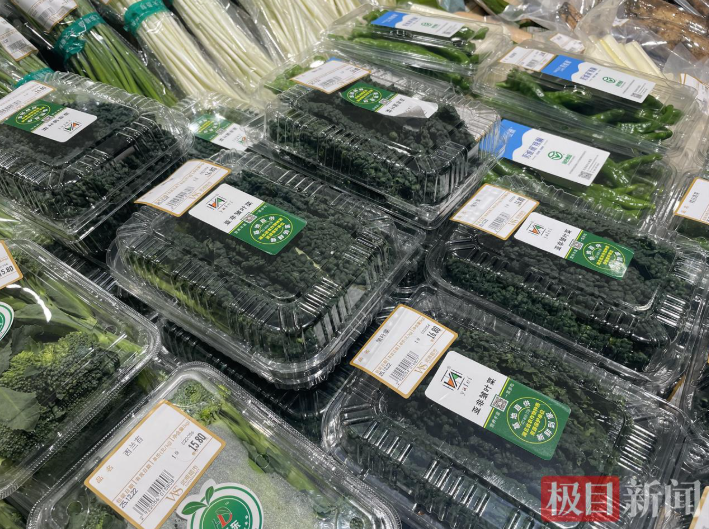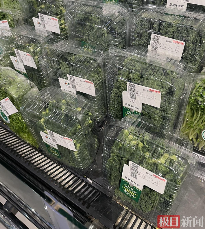 12月22日,极目新闻记者来到位于武汉经开区的中百仓储(金凯购物广场店)探访看到,皱叶菜通过小份盒装的形式进行销售,每盒价格在8元至10元不等,皱叶菜包装盒显示的单价为59.8元/kg,相比附近摆放的其他蔬菜价格要贵不少。一旁的工作人员称,皱叶菜多是年轻人购买的比较多,老年人没有吃过购买的还不多。市民李女士表示,之前在巴奴吃过,没想到超市也有卖的了,准备买点回去涮火锅吃。