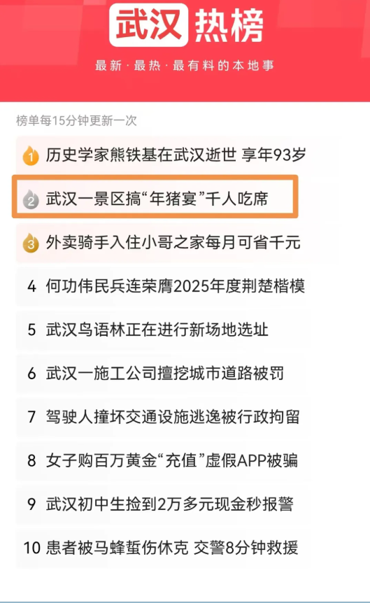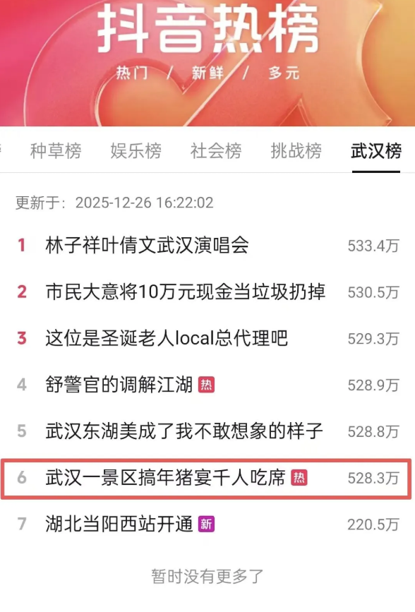 景区负责人告诉记者,这些菜武汉任何餐厅都能做,但一千多人围坐一起热热闹闹吃顿饭的氛围,是餐厅给不了的。这种真实的热闹氛围,成为吸引包括远方游客专程前来的核心原因。