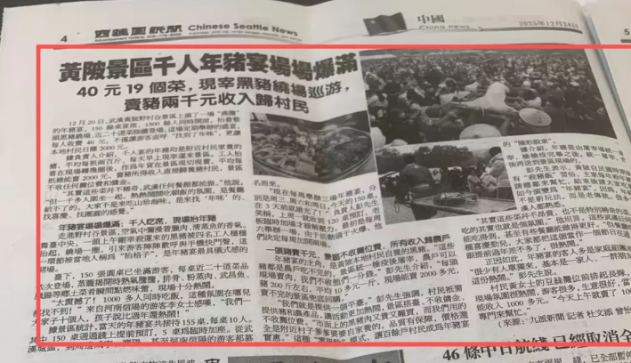 近日,黄陂区野村谷景区举办年猪宴,150余桌1500余人同时开席的场面,经九派新闻报道后引发全网关注。1月9日,该篇图文报道被海外华文媒体西雅图新闻于2025年12月24日进行了全文转载,引发了一场跨地域的文化传播。