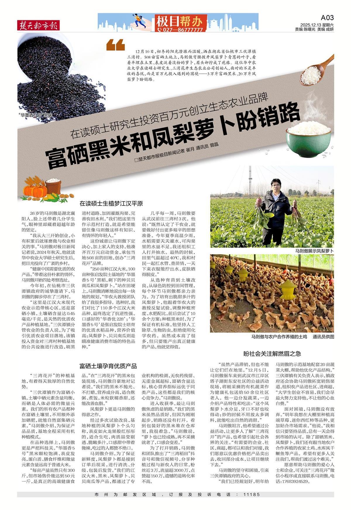 “在读硕士研究生投资百万创立生态农业品牌,富硒黑米和凤梨萝卜盼销路”,2025年12月13日,楚天都市报极目新闻反映华农研究生创业团队投资创立生态农业品牌农产品滞销后,引起社会广泛关注。连日来,湖北省政协委员、武汉锦康餐饮管理有限公司董事长夏兴华,湖北小龙虾头部餐饮企业肥肥虾庄董事长柴标,湖北藕汤头部连锁企业来菜·湖北头牌藕汤公司等多家餐饮企业,总计采购30000斤凤梨萝卜,以实际行动支持在校大学生创新创业。