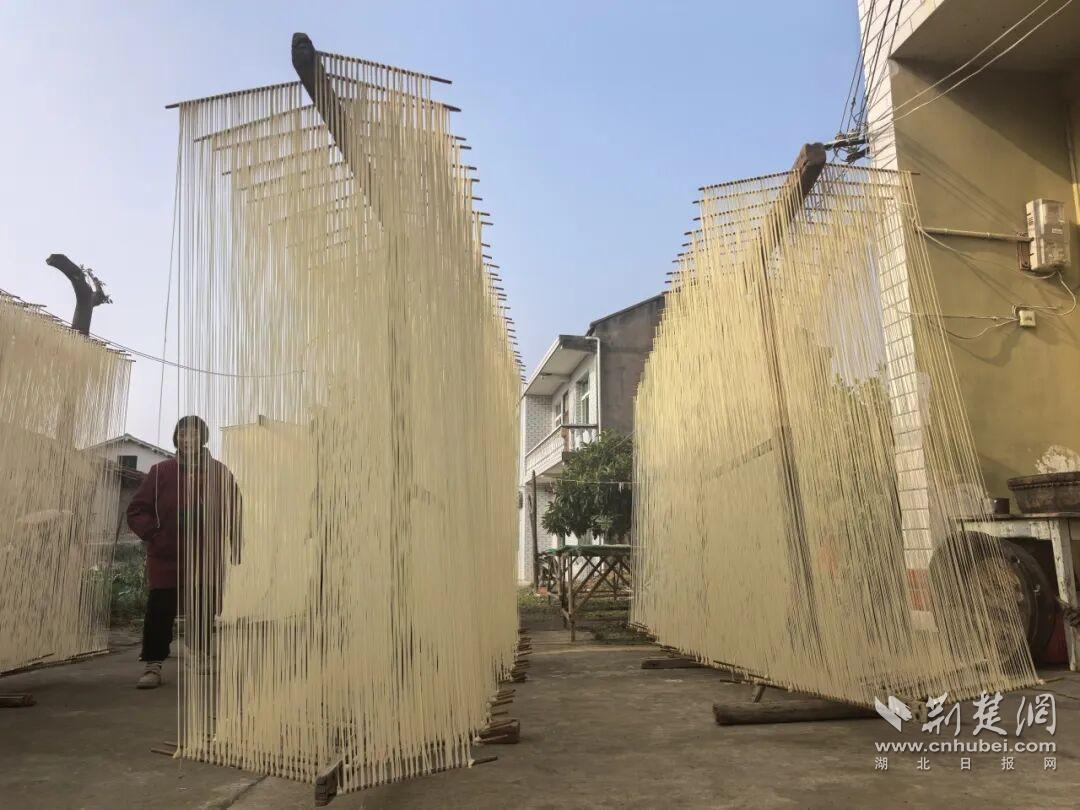 天未亮,李家集街方安集村的院场就热闹起来了。细竹竿整齐排开,师傅们手法娴熟地将柔软的面坯绕上竹竿,再用长棍轻轻挑起,一拉一弹,原本厚实的面坯瞬间变成细密的丝线,垂在竹竿上随风轻晃,晨光洒在上面,泛着温润的微光。这一幕,是黄陂腊月最动人的烟火图景。