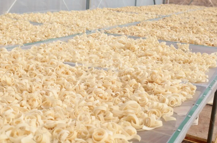 在黄陂区李集街驻程岗村一片远离闹市的山坡上,一片白色遮阳棚下,上百斤新制豆丝正整齐铺展在晾晒架上,豆香四溢。这是90后“新农人”易心慧为黄陂豆丝打造的专属无尘晾晒区——也是她让“家乡味”走向全国的关键一环。