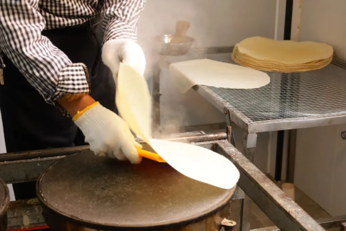 1月28日,记者看到,工人将精选米豆按精确比例浸泡、磨浆,随后由人工辅助机器摊饼,可以实现每块饼的厚度一致,并确保受热均匀。摊好的米饼经高温蒸熟后,卷成筒状,再切成细条。“这是很费人工的一个过程,卷起来切,体积小、不易碎,运输损耗大大降低。”易心慧解释。