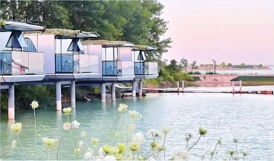巧妙利用梁子湖畔的地理优势,墨斗山居·水涟云漪不仅有15间特色民宿,还开拓了6000平方米临湖草坪和上万平方米露营草坪,还有湖景茶室、会议室、中餐厅等配套设施。在这里,可以体验露营烧烤、拓展游戏、手工制作、果蔬采摘等特色乡野乐趣。“我们可以根据企业的爱好和需求,个性化定制团建项目,争取让大家玩得尽兴。”墨斗山居民宿负责人李红表示。