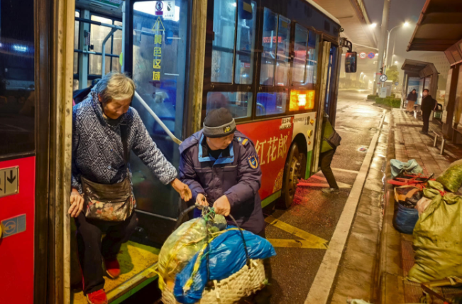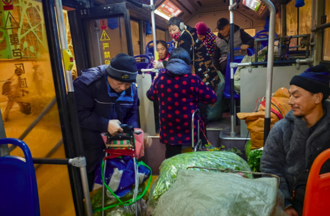 “大家慢一点,小心脚下,重的菜我来帮你们抬。”清晨5时15分,瞿啟发驾驶着“兴农专线”从盐坊湾公交停车场准点发车。5时29分,车辆稳稳停靠在三三零三工厂站,车门一开,菜农们肩扛手提,带着沾着晨霜的红菜苔、小白菜、大蒜叶等时令蔬菜走进车厢。见状,瞿啟发立刻起身,一边耐心维持秩序,一边主动上前帮扶年迈菜农,将沉重的菜筐稳稳抬上车。