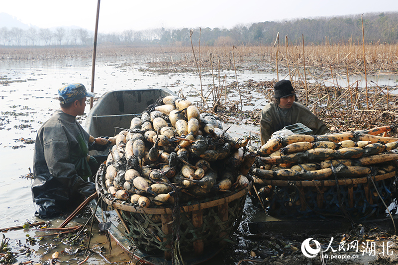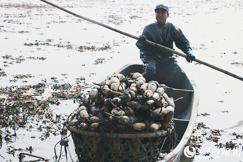 永利村的藕塘中,挖藕工满载而归。人民网记者 郭婷婷摄
