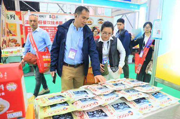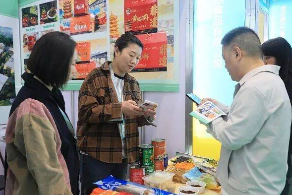 武汉市黄陂三鲜食品加工有限公司的展位前,包装精致的黄陂三鲜系列产品整齐陈列,不少合作多年的老客户专程赴展对接,复购下单。