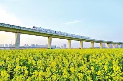 武汉地铁16号线穿梭于金色花海