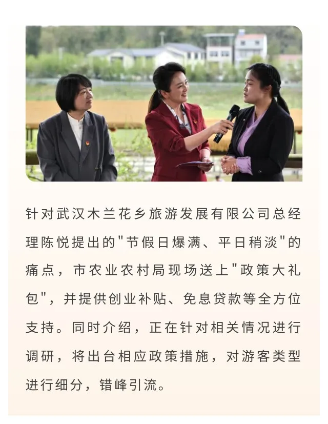 首场政策专场在景致秀美、生态宜人的黄陂区裕和夫子山居举办,市农业农村局、市文旅局、市商务局、市妇联等多部门党支部齐聚一线,围绕农文旅融合、电商助农、城乡商贸流通、巾帼助农四大主题,全方位解读惠企惠民政策,现场答疑释惑,以党建引领推动乡村振兴,加快国际消费中心城市建设。