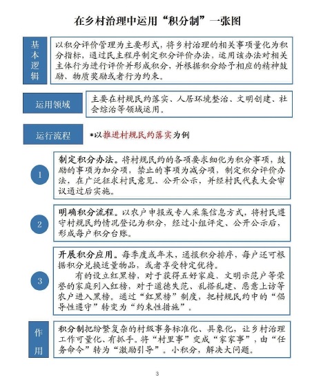 二、积分制要结合当地农村发展实际情况,针对工作中的薄弱环节,从农民群众最关心、最迫切的治理问题入手,比如整治农村人居环境、推进移风易俗、营造文明乡风等。