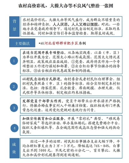 经过治理,邯郸市肥乡区红白喜事盲目攀比、大操大办和天价彩礼现象得到有效遏制。村民红白喜事操办支出大幅下降,平均办理红事支出为2-3万元,降幅高达76%-84%;白事支出不到5000元,不及之前的六分之一。集体婚礼、旅行结婚等婚事新办和丧事简办已逐步成为当地的新习俗。