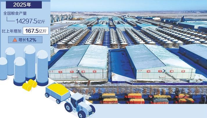2025年我国粮食再次高位增产,全国粮食产量14297.5亿斤,比上年增加167.5亿斤,增长1.2%。但也要看到,粮食稳定供应还面临供需长期紧平衡、价格波动、结构性短缺、进口来源渠道单一等问题,粮食安全基础还需进一步巩固。