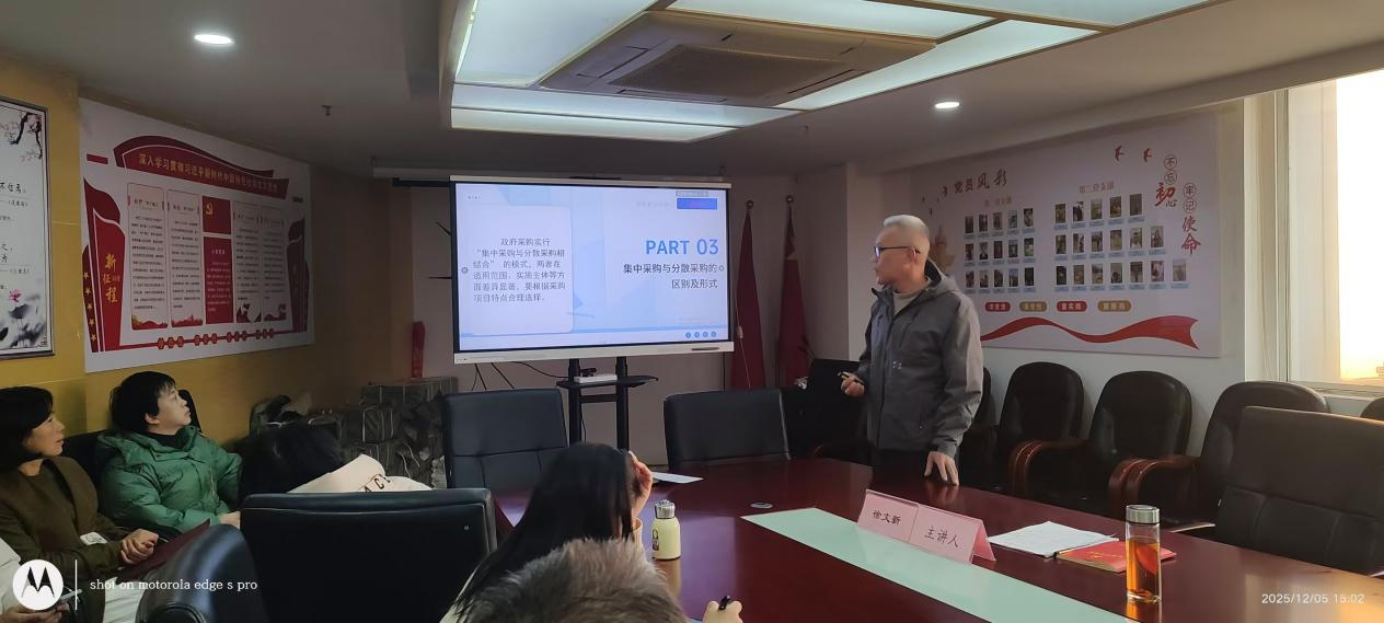 为落实局党组“干部素质提升年”工作部署、深化“干中学、学中干”学习型组织建设,2025年12月5日下午,武汉市农业技术推广中心在中心大会议室组织开展“农技先锋大讲堂”首期专题学习交流活动。本次活动由中心副主任徐文新围绕“政府采购基本规范”作专题授课,旨在通过系统解读政府采购相关政策法规,增强全体干部职工对政府采购工作的理解与把握。中心领导班子成员、各科室负责人及全体干部职工共计40余人参加学习交流。