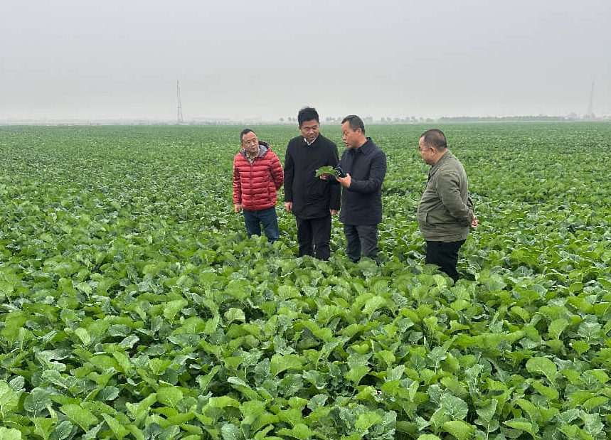 12月12日,中心主任张凯带领种业科相关技术人员对油菜新品种集中展示工作进行现场检查与指导。在示范基地,油菜新品种以每亩一区的规格集中种植,长势均匀,田间管理规范。张凯主任一行深入田间,仔细察看不同品种的苗情长势、田间表现,详细了解前期播种、田间管理及数据记录情况。他强调,新品种展示评价是连接科研育种与生产应用的关键环节,必须坚持科学、公正、严谨的原则,系统收集各品种在生育期、农艺性状、抗逆性和产量等方面的关键数据,真正将表现优异、适应性强的品种筛选出来,服务政府决策,引导农民选用,助力企业创新。