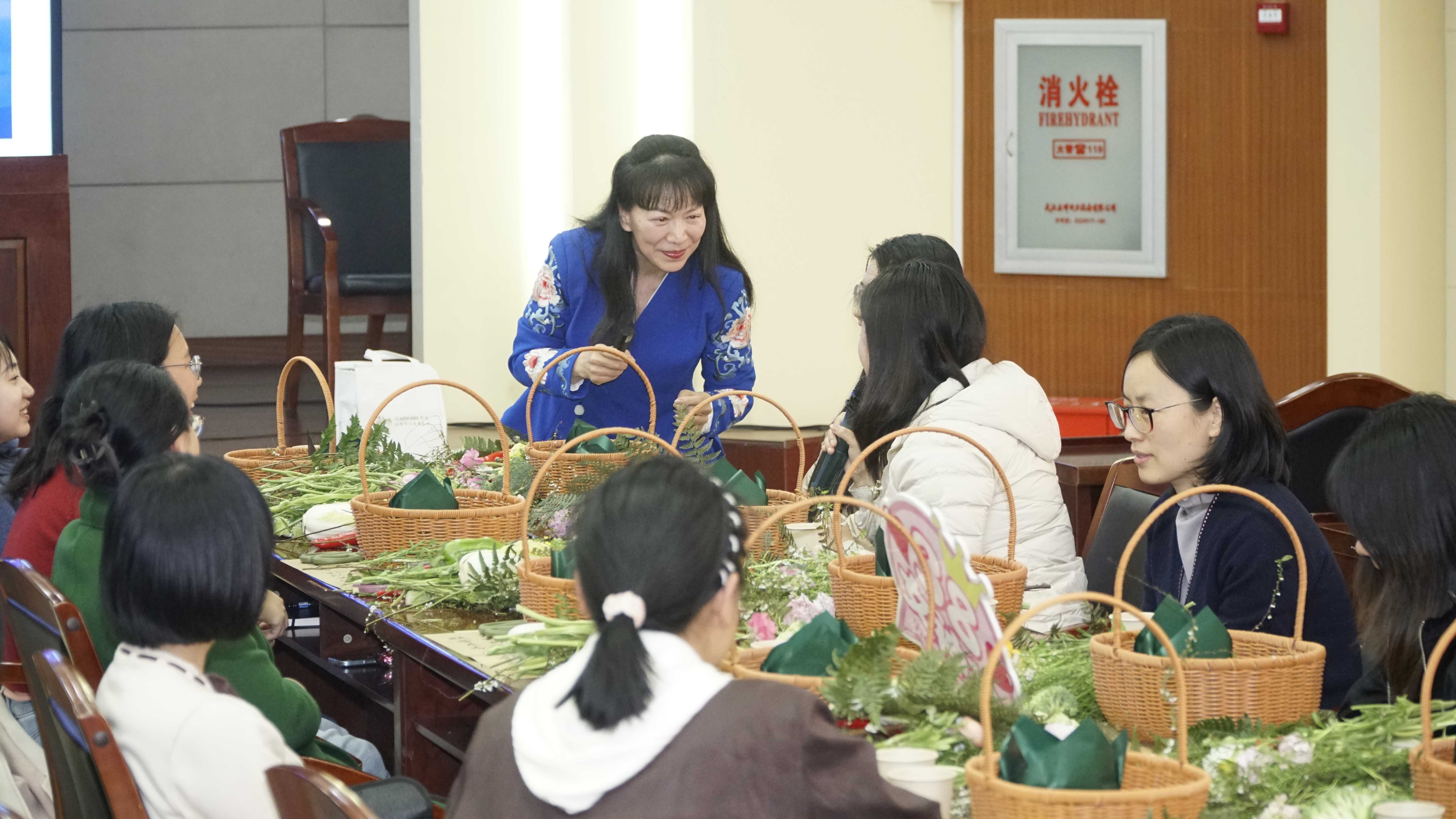 活动特别邀请了全国光明领读人、“武汉市杰出女性”夏燕老师作《颜言双修 悦读美好》主题讲座,以生动的分享带领大家在阅读中感悟美好、修炼自我,让在场女同胞深受启发;传统非遗知音花艺代表性传承人、武汉汉阳知音花艺协会会长柯杏林现场开展蔬果插花教学,手把手带领大家体验非遗花艺的独特魅力,在柯老师的耐心指导下,大家亲手创作的蔬果插花作品各具匠心,雪柳、洋牡丹、油菜花等春日花材与辣椒、菜苔、西蓝花等新鲜蔬果巧妙组合,一篮篮别具巧思的春日花艺作品次第绽放,既有泥土的鲜润气息,又有书香的温润底色。活动尾声,大家手捧亲手制作的蔬果花篮,在春日暖阳下合影留念。